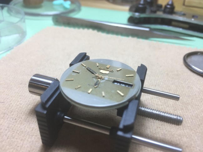 Để tránh xước mặt số, WRVN dùng miếng lót Bergeon trước khi gỡ bộ kim. Ở góc chụp này cho thấy bộ kim còn nguyên bản sáng bóng.